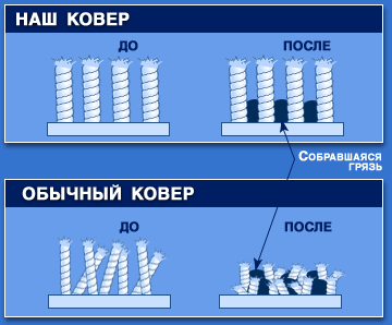 | Сам ковер быстро становится дополнительным ИСТОЧНИКОМ грязи | Надежно удерживают грязь вплоть до следующей замены |