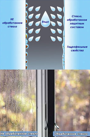 По необработанной поверхности вода скатывается в виде капель, не смывая большинства загрязнений, а, наоборот, образуя нежелательные разводы и подтеки. Так как на необработанном стекле вода высыхает значительно дольше, на него гораздо быстрее налипают новые загрязнения.